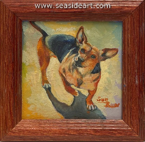 Dog an oil painting by Sun Bauer (Arizona). The art measures 3" x 3" and the frame is 4 1/2" ...