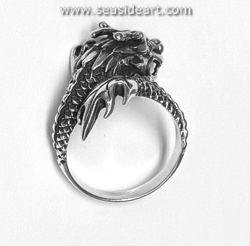 A sterling silver ring in the shape of a dragon. The ring is a size 10 and it is marked:...