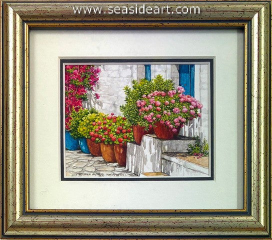 Colorful Village Garden, Greece is a watercolor painting by Chrysoula Argyros (South Africa). The art measures 2 3/4″ x 3...