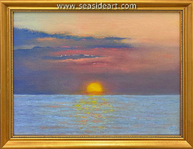 Sundown, Moonrise, Sound Side an oil painting by Cindy Bridgman. The art measures 16" x 8" and the frame measures...