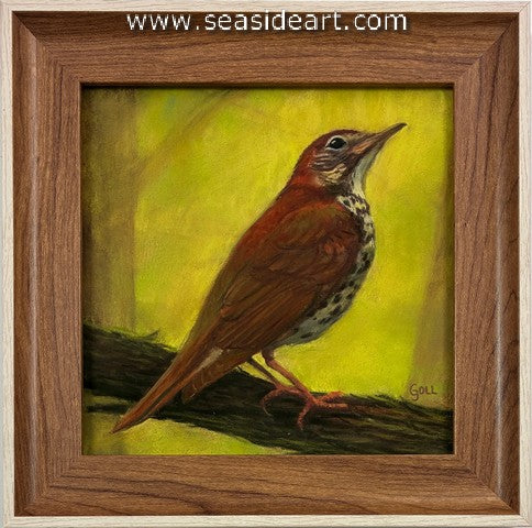 Thrush in the Spring Wood a pastel painting by Lori Goll. The art measures 6″ x 6″ and the frame...