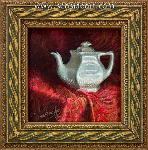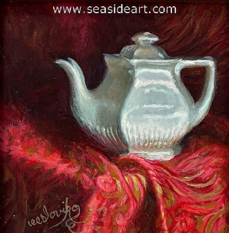 Silver Teapot a pastel by Judy Leasure. The art measures 6" x 4" and the frame measures 7 1/4" x ...